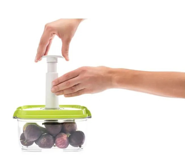 Pomocou ručnej vákuovacej pumpy, ktorá je súčasťou sady, jednoducho odsajete vzduch z nádoby, čím vaše potraviny ochránite pred vonkajšími vplyvmi. Okrem ručnej pumpy môžete použiť aj elektrickú vákuovaciu pumpu alebo vákuovačku potravín s funkciou CANISTER.