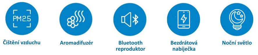 Čistička vzduchu je navyše vybavená integrovanými Bluetooth reproduktormi, vďaka ktorým si môžete ľahko prehrávať svoju obľúbenú hudbu priamo z mobilného telefónu a vytvoriť si tak príjemnú atmosféru, ktorá spája čistý vzduch s relaxáciou aj zábavou.