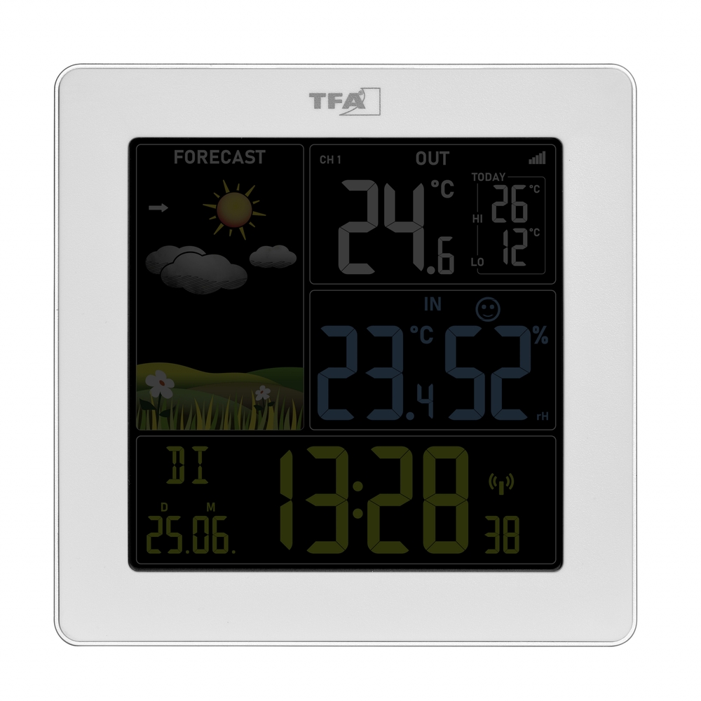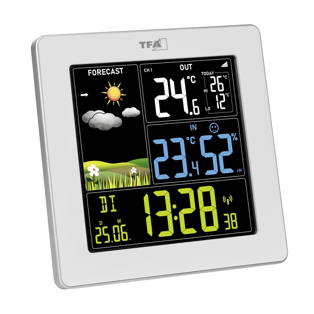 Prehľadný farebný displej. Vonkajšia teplota s dennou minimálnou a maximálnou hodnotou. Vnútorná teplota a vlhkosť. Predpoveď počasia.