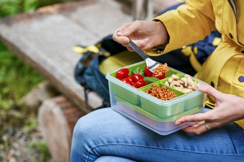 Obedový box s oddelenými vložkami a krabičkou vo vnútri. 100% vodotesný, hygienický a bezpečný. Vhodný do mikrovlnnej rúry, mrazničky a umývačky riadu. Záruka 30 rokov.
