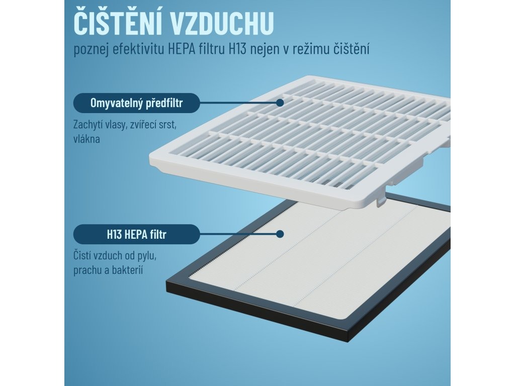 Prístroj je dodávaný s HEPA H13 filtrom, ktorý s vysokou účinnosťou z nasatého vzduchu odstraňuje najjemnejšie poletujúce nečistoty, ako sú spóry plesní, peľ, zvieracie alergény, ale aj jemný prach a baktérie.Inteligentné ovládanie pomocou mobilnej aplikácie